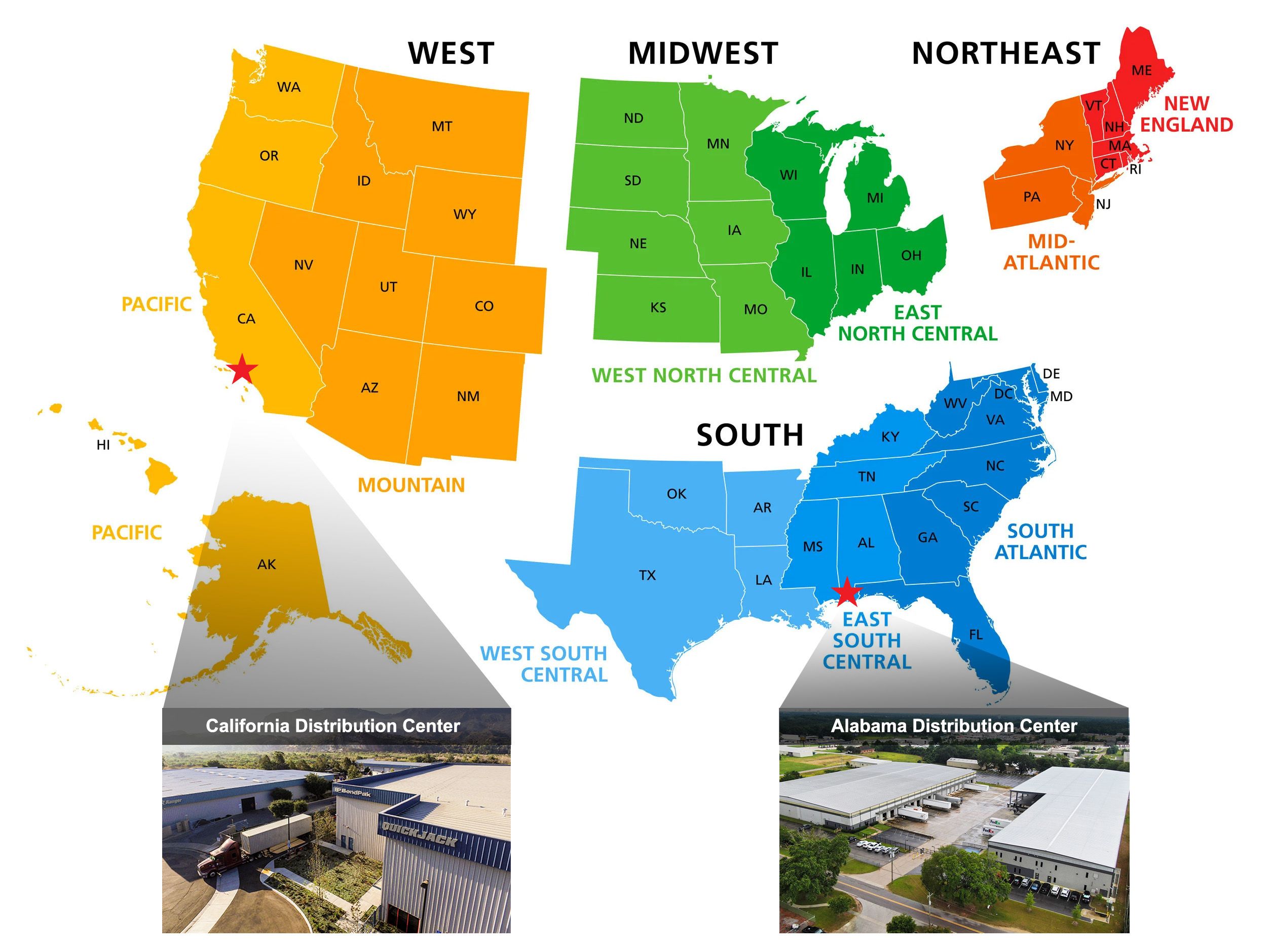 With distribution centers located in Santa Paula, CA, and Mobile, AL, our goal is to ship orders destined for the West from our Santa Paula, CA location, and orders destined for the Midwest, Northeast, and South regions from our Mobile, AL distribution center.